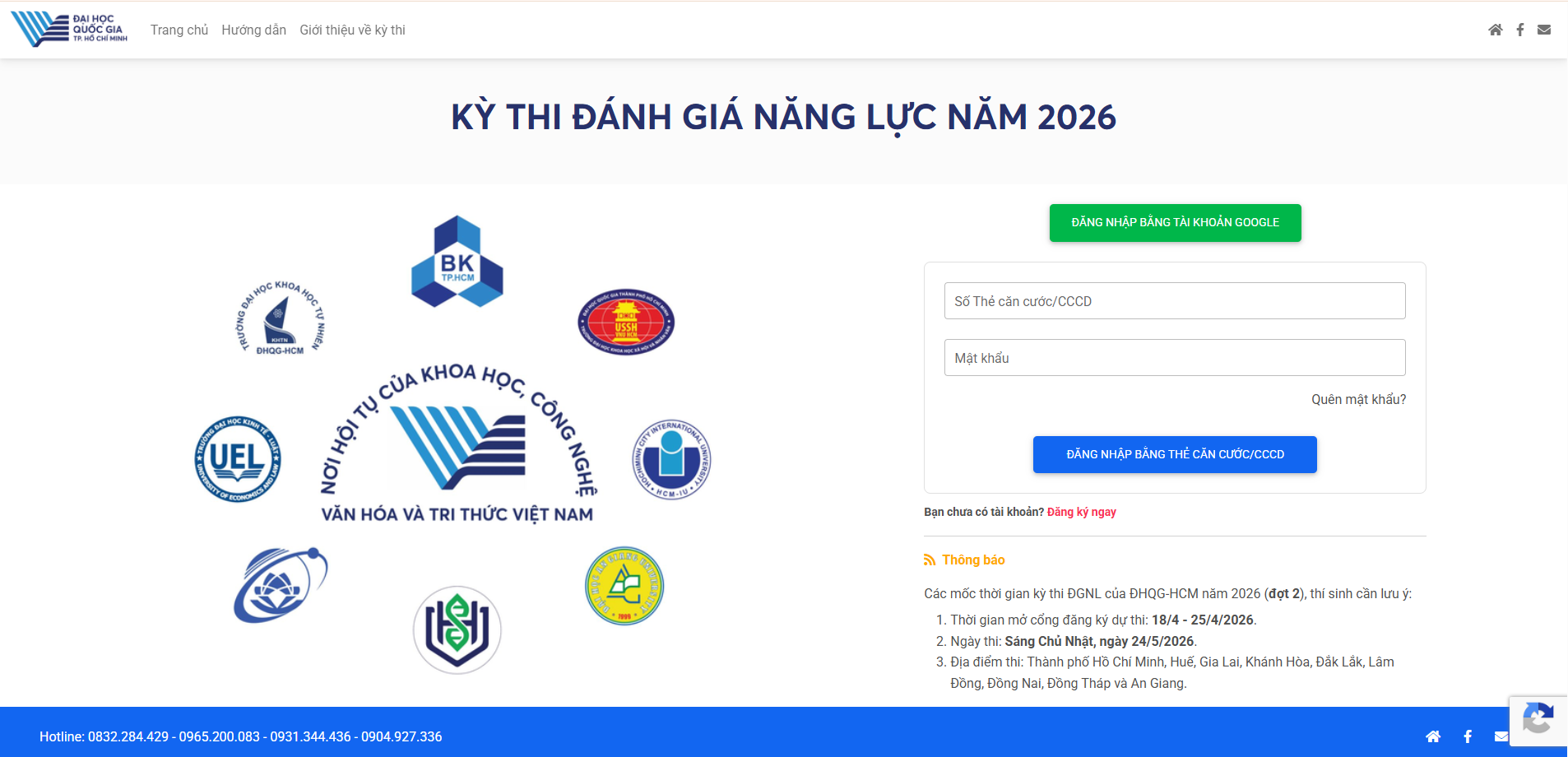 Giao diện cổng thông tin của kỳ thi đánh giá năng lực