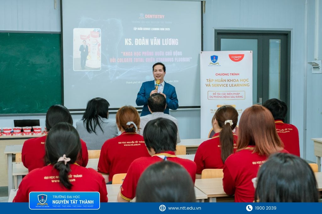 NTTU – Sáng ngày 24/3, khoa Răng Hàm Mặt Trường Đại học Nguyễn Tất Thành (NTTU) phối hợp với Công ty Colgate-Palmolive Việt Nam tổ chức thành công buổi tập huấn chuyên đề “Nha khoa dự phòng: Khoa học của phòng ngừa chủ động”. Chương trình nhằm trang bị cho sinh viên Răng Hàm Mặt, ngay từ năm thứ nhất, những kiến thức nền tảng quan trọng để sớm tiếp cận với các chuẩn mực quốc tế và tư duy của bác sĩ trong y học hiện đại với tinh thần “Phòng bệnh hơn chữa bệnh”, đồng thời chuẩn bị cho sinh viên tham gia các hoạt động phục vụ cộng đồng (Service Learning)