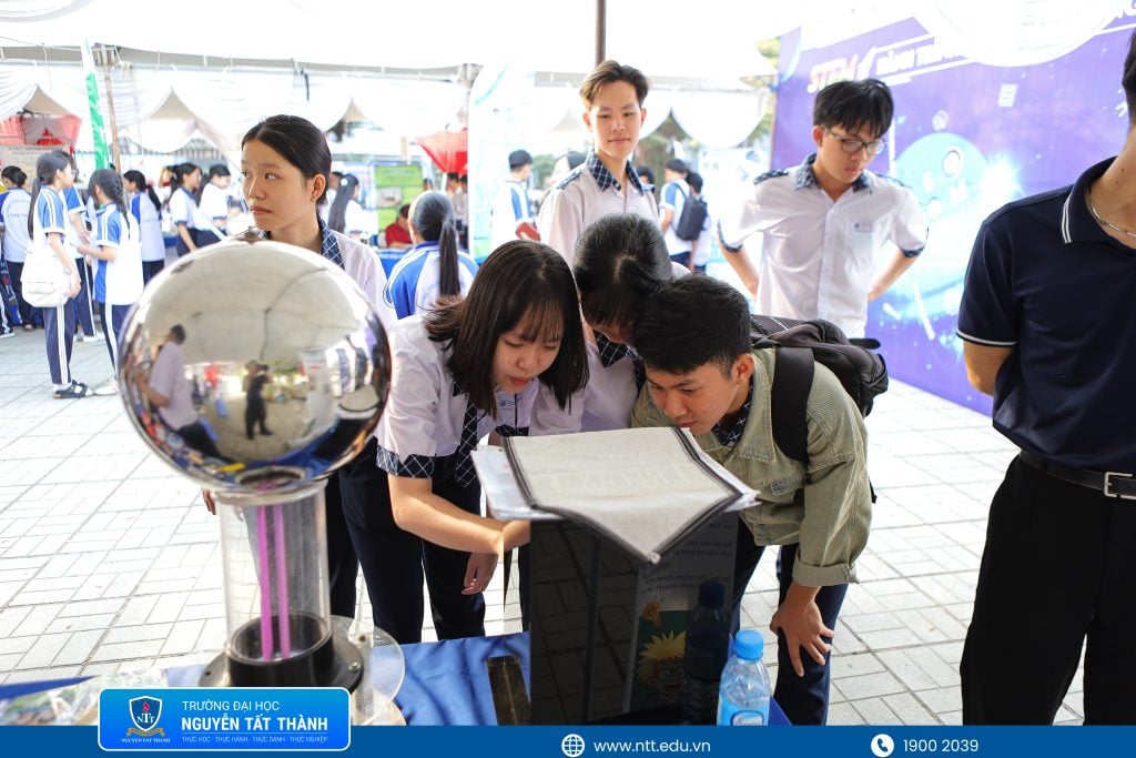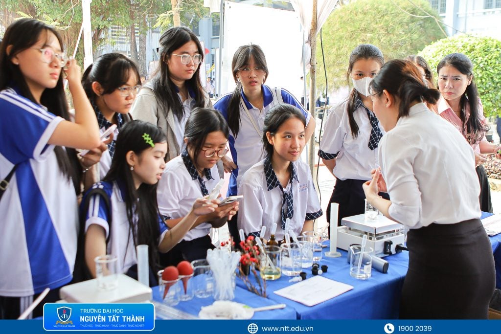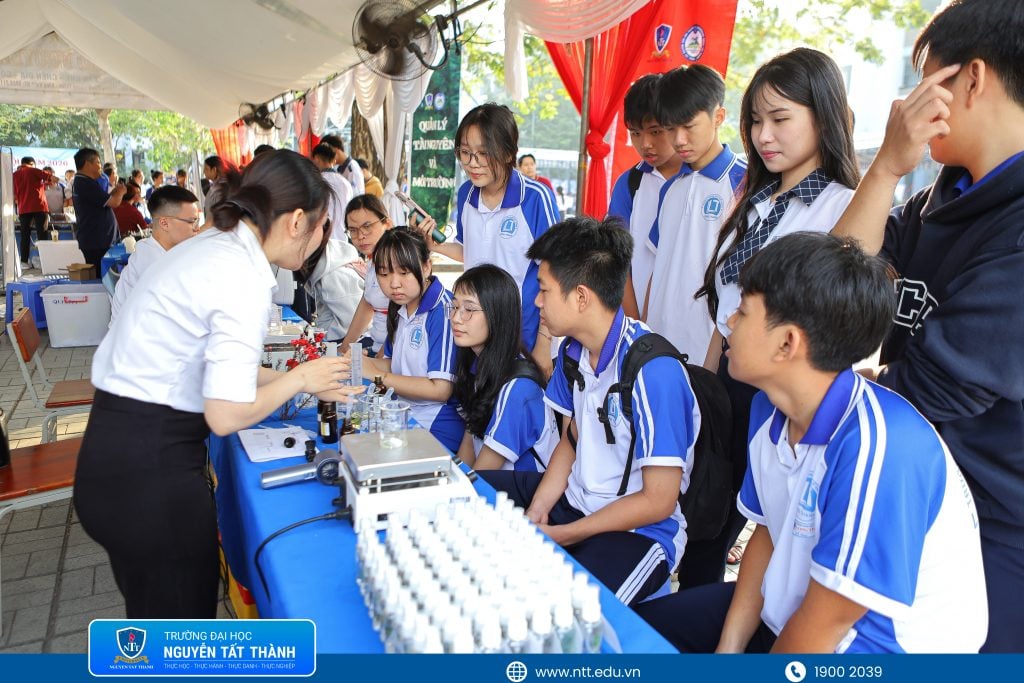 Học sinh trải nghiệm tại các gian hàng của Trường ĐH Nguyễn Tất Thành