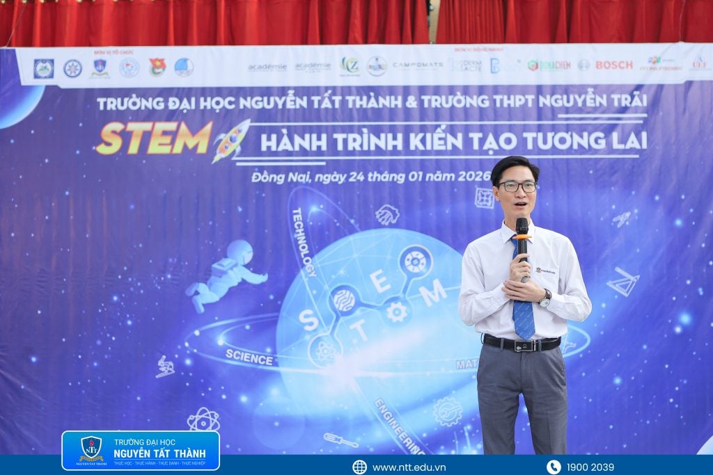 Ngày hội vinh dự đón tiếp PGS.TS. Đinh Văn Phúc – Viện trưởng Viện Khoa học Liên ngành, Trưởng khoa Khoa học Ứng dụng & Công nghệ, TS. Võ Thị Diệu Hiền – Phó Trưởng khoa Khoa học Ứng dụng & Công nghệ, cùng đội ngũ giảng viên, chuyên viên Trường Đại học Nguyễn Tất Thành và đại diện các doanh nghiệp đồng hành. Trong phần giao lưu, chia sẻ, PGS.TS. Đinh Văn Phúc đã mang đến những câu chuyện gần gũi, truyền tải thông điệp mạnh mẽ về vai trò của STEM trong việc phát triển tư duy logic, năng lực giải quyết vấn đề và khả năng thích ứng của học sinh trước những biến đổi nhanh chóng của xã hội hiện đại. Những chia sẻ chân thực đã thắp lên sự tự tin và niềm hứng khởi học tập cho các em học sinh.