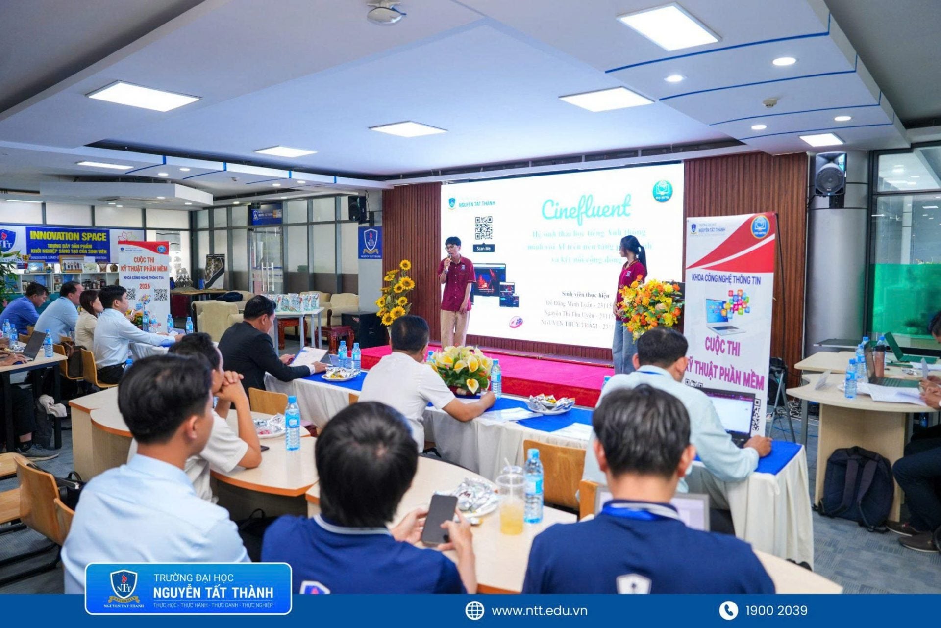 Ban giám khảo và sinh viên theo dõi, đánh giá các phần trình bày tại cuộc thi phần mềm NTTU 2026