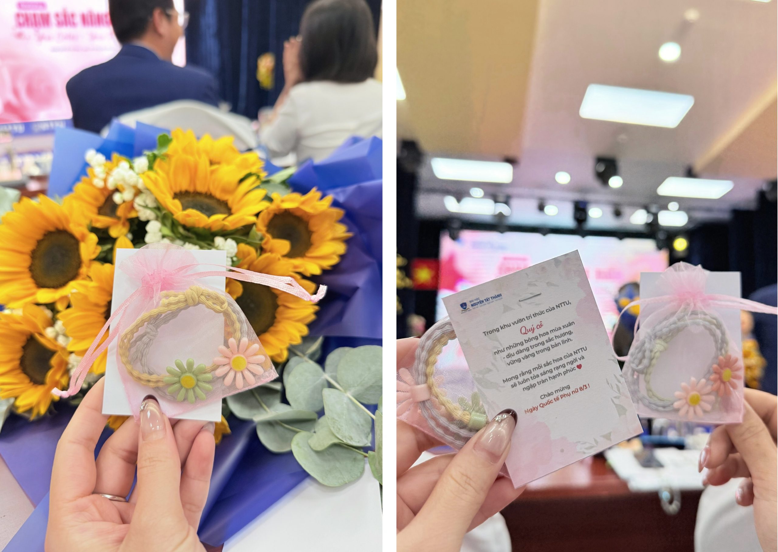 Tại workshop “Chạm sắc Nàng Xuân”, Ban tổ chức đã gửi tặng những món quà xinh xắn kèm lời chúc ý nghĩa dành cho nữ cán bộ, giảng viên tham dự. Không chỉ là một món quà lưu niệm, đó còn là lời tri ân và lời chúc tốt đẹp, lan tỏa sự trân trọng và yêu thương trong cộng đồng nhà NTTU